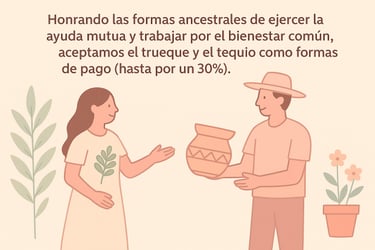 El Trueque se realiza intercambiando nuestros servicios por otros que requerimos para el funcionamiento y uso óptimo de nuestras instalaciones: carpintería, electricidad, plomería, publicidad, fotografía; mantenimiento de equipos, aparatos eléctricos y electrónicos; por herramientas (podadoras, escaleras, picos, palas…) y equipos de trabajo (computadoras, impresoras , bocinas, pantallas…) y también, a través del intercambio de productos diversos que podamos vender en la Tiendita de Ana (remedios, productos locales, artesanías, instrumentos musicales, joyería, ropa, libros). Así, cuando las personas nos compran, nos ayudan a ayudar a quienes lo necesitan.