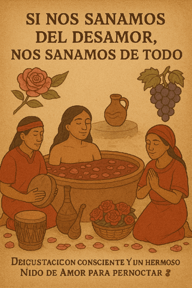 El Baño de Vino Tinto con pétalos y esencias de rosas sirve de marco para asentir y sanar el desamor hacia nosotros mismos, de los demás hacia nosotros y de nosotros hacia los demás. El panhuehuetl, el popoxcomitl, el ayacaxtle y las totolakati acompañan el canto a través del cual elevamos nuestro rezo al Espíritu del Agua, de las Uvas y de las Rosas para el retorno a la esencia amorosa que reside en nuestro ser. Altamente recomendable para parejas.